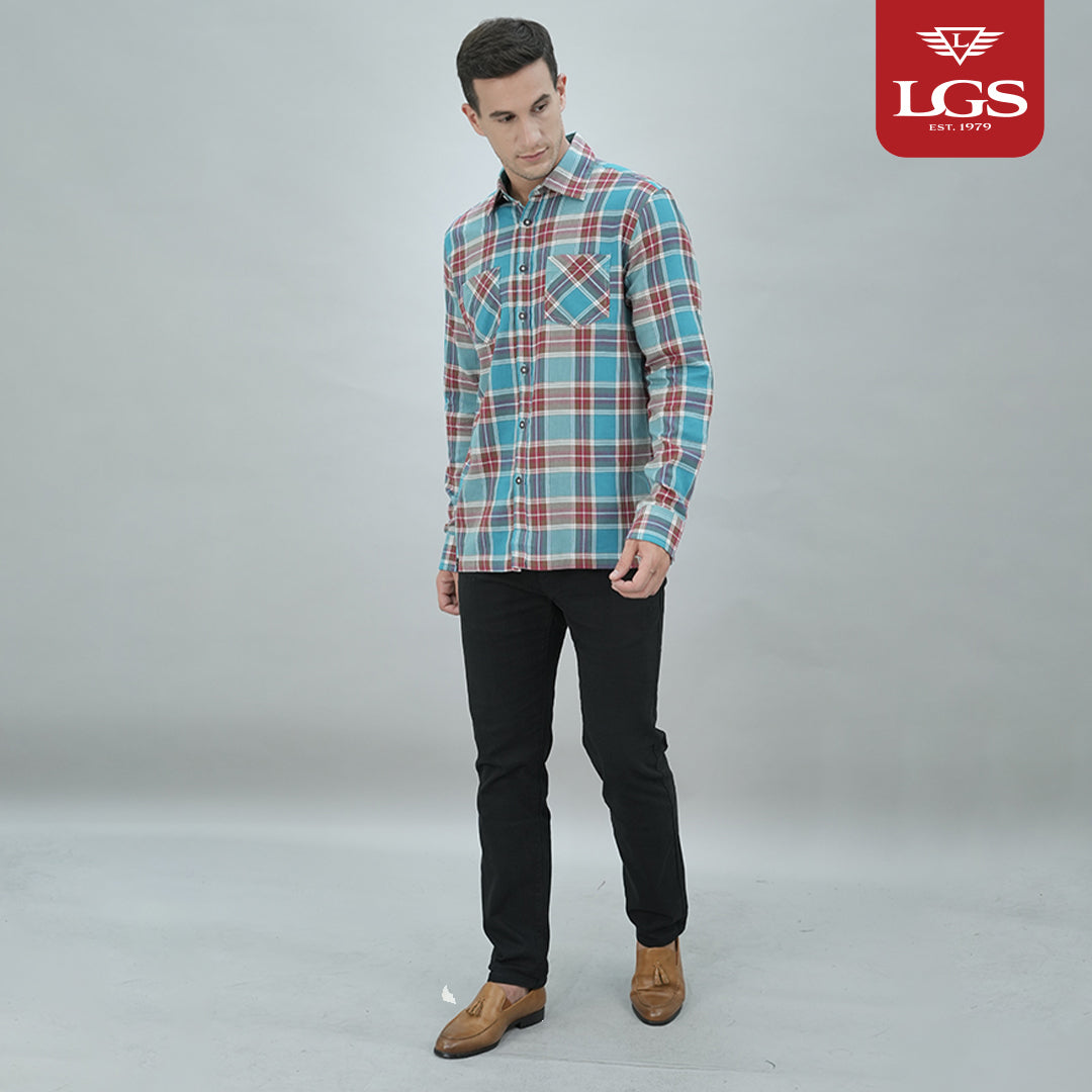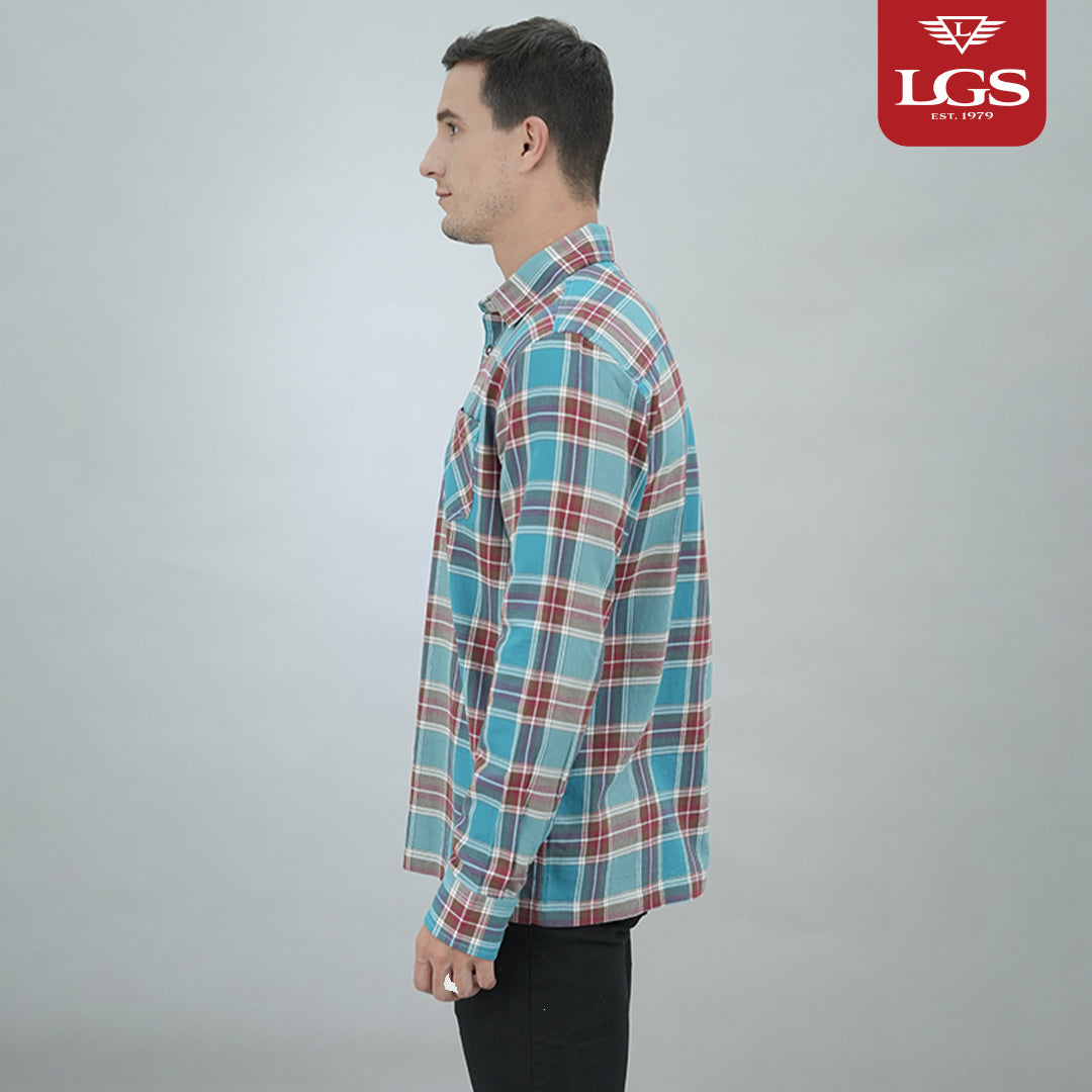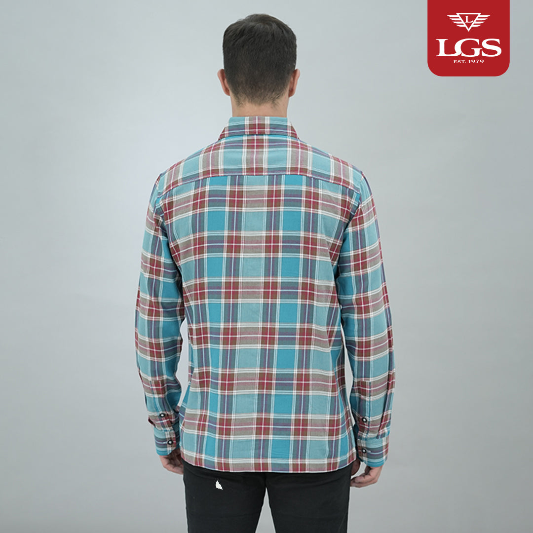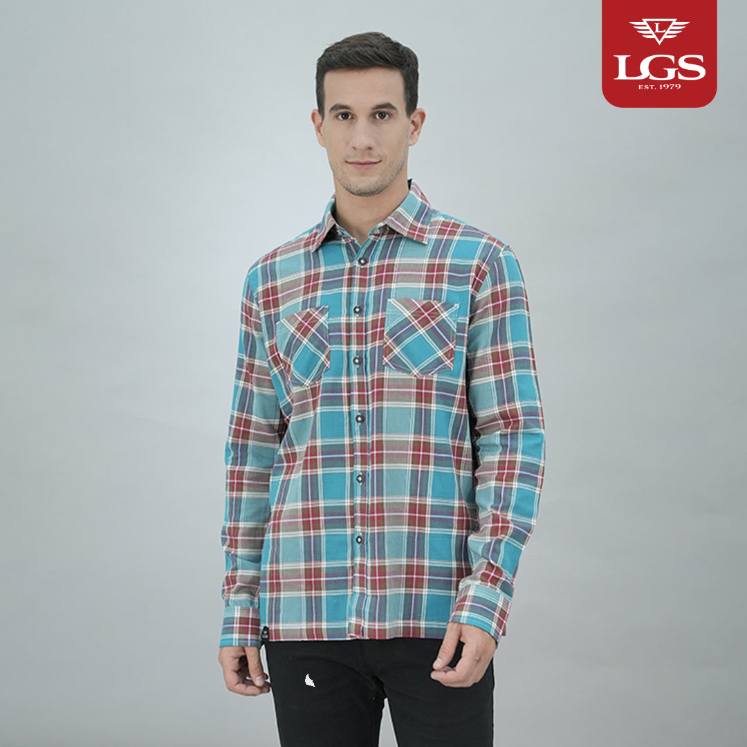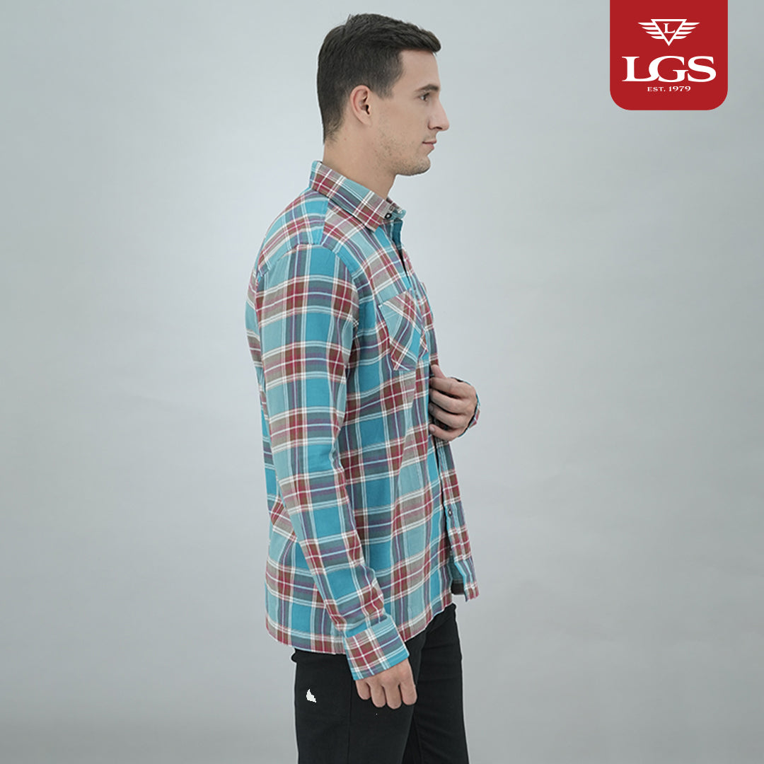 Kemeja Macario dari LGS dengan Motif Kotak-Kotak, menampilkan kombinasi warna biru dan merah.