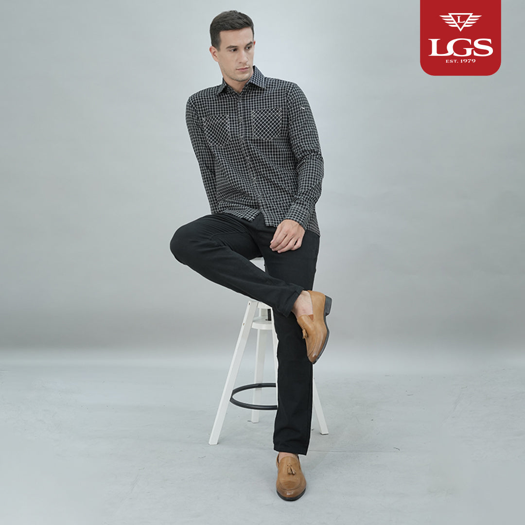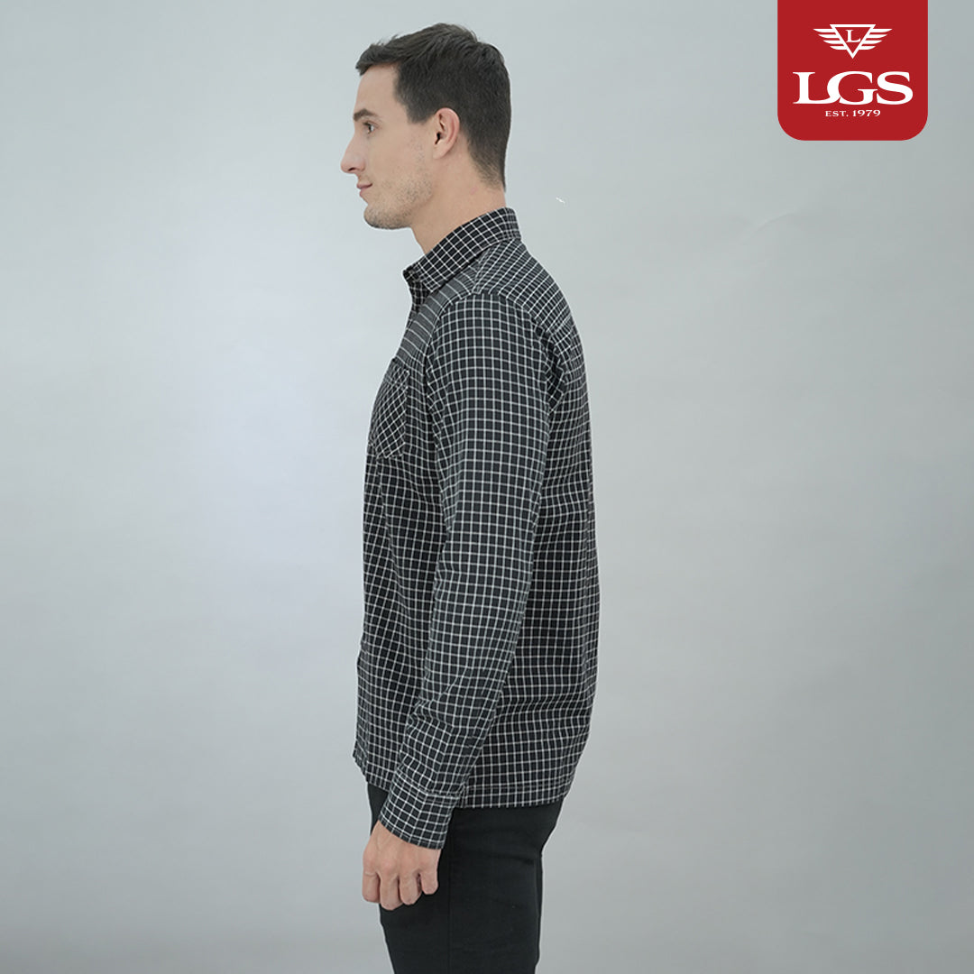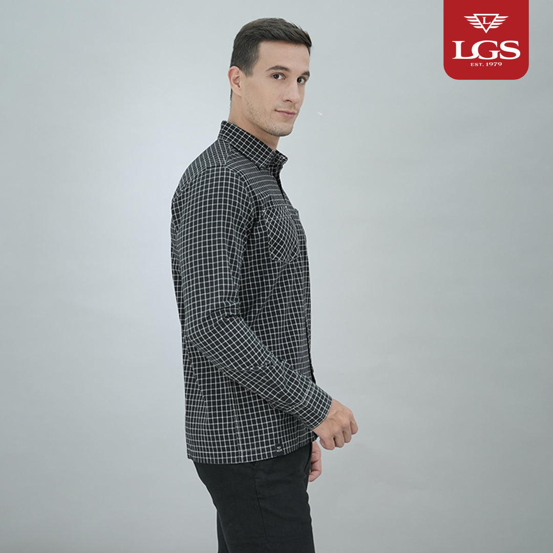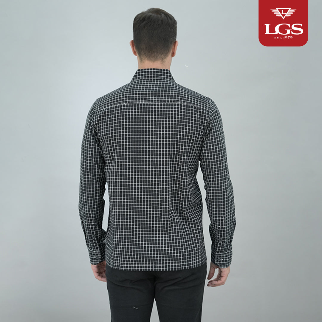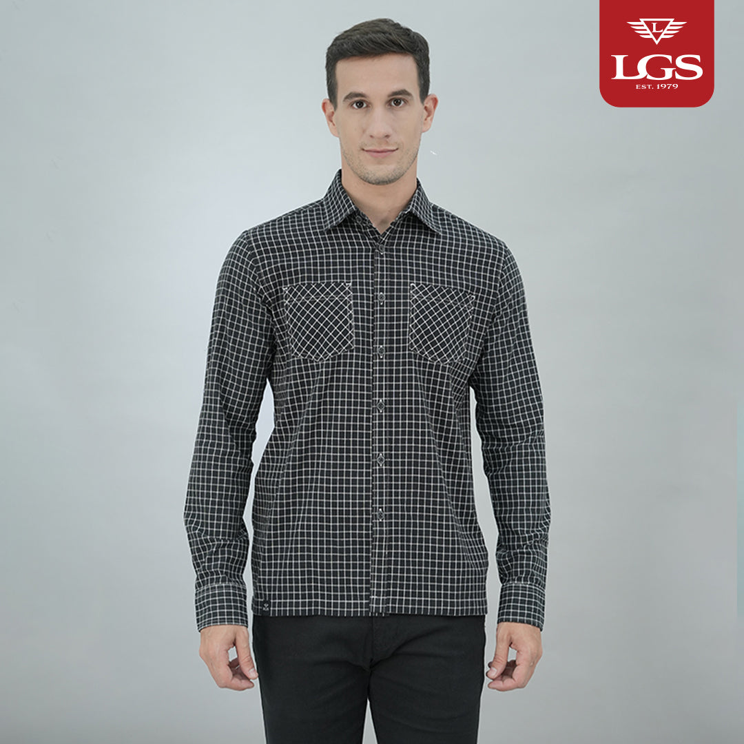 Kemeja Macario dari LGS dengan Motif Kotak-Kotak, menampilkan kombinasi warna hitam.