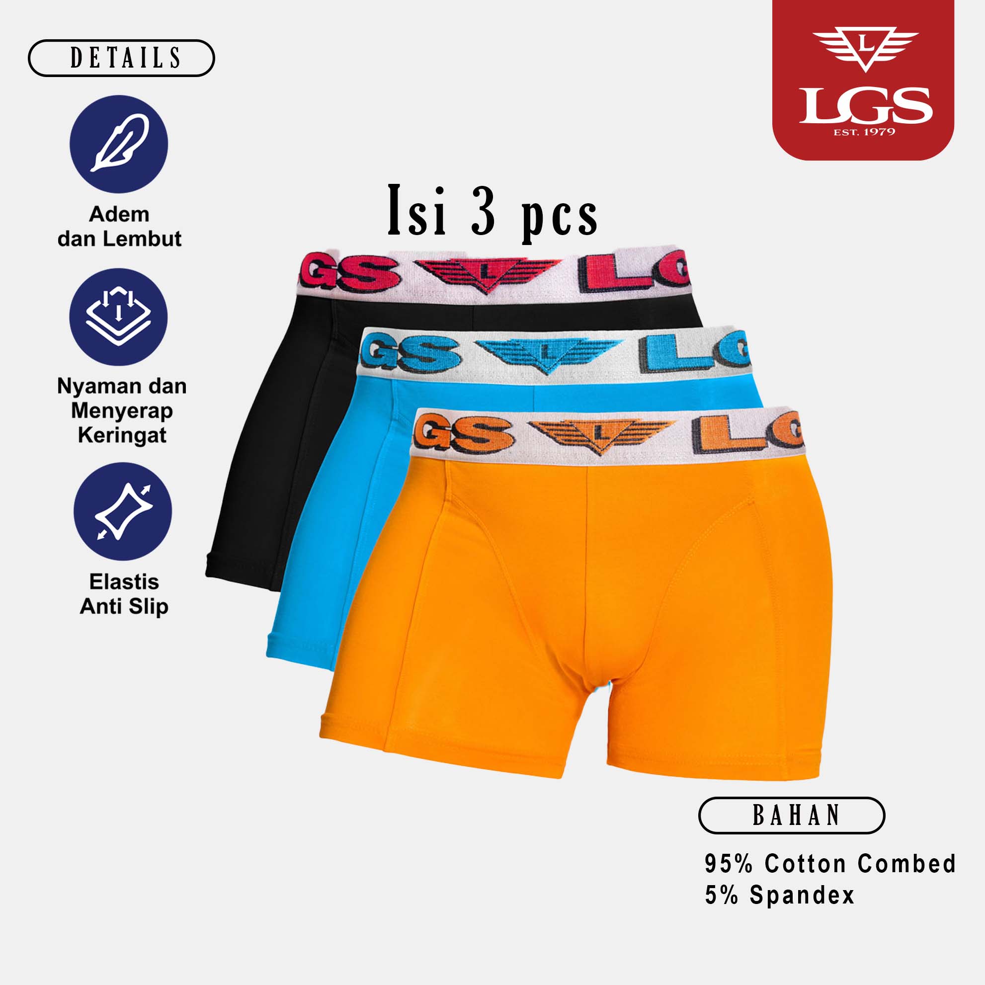Underwear LGS dengan model Boxer 1 box isi 3 Model karet dengan logo LGS Bahan Katun yang sangat nyaman Ref: LEBX.002.656.3.7C