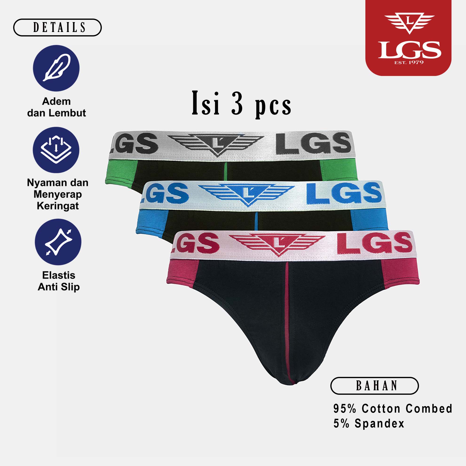 3 Pcs Underwear dari LGS dengan model mini brief. Terdiri dari warna biru, merah, dan abu. Menggunakan bahan yang berkualitas dan nyaman dipakai.