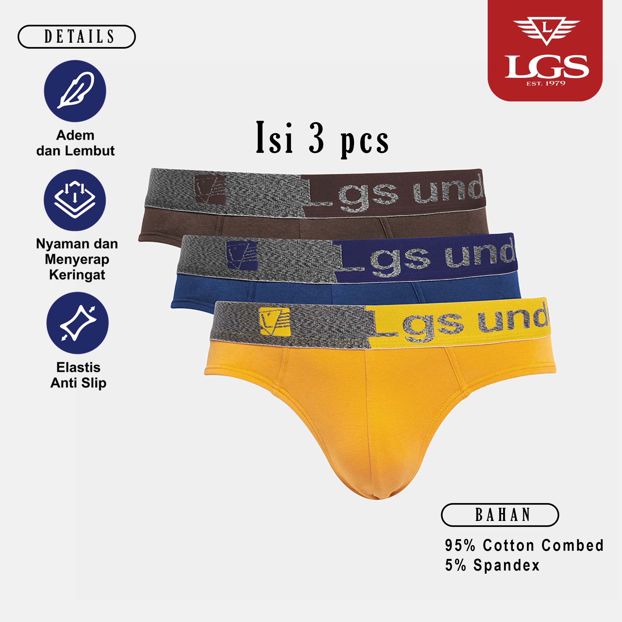 Pakaian dalam dari LGS 3 Pcs dengan pilihan warna yang menarik. Terbuat dari bahan berkualitas yang sangat nyaman dipakai. Ref : LEMN.002.834.3.7C