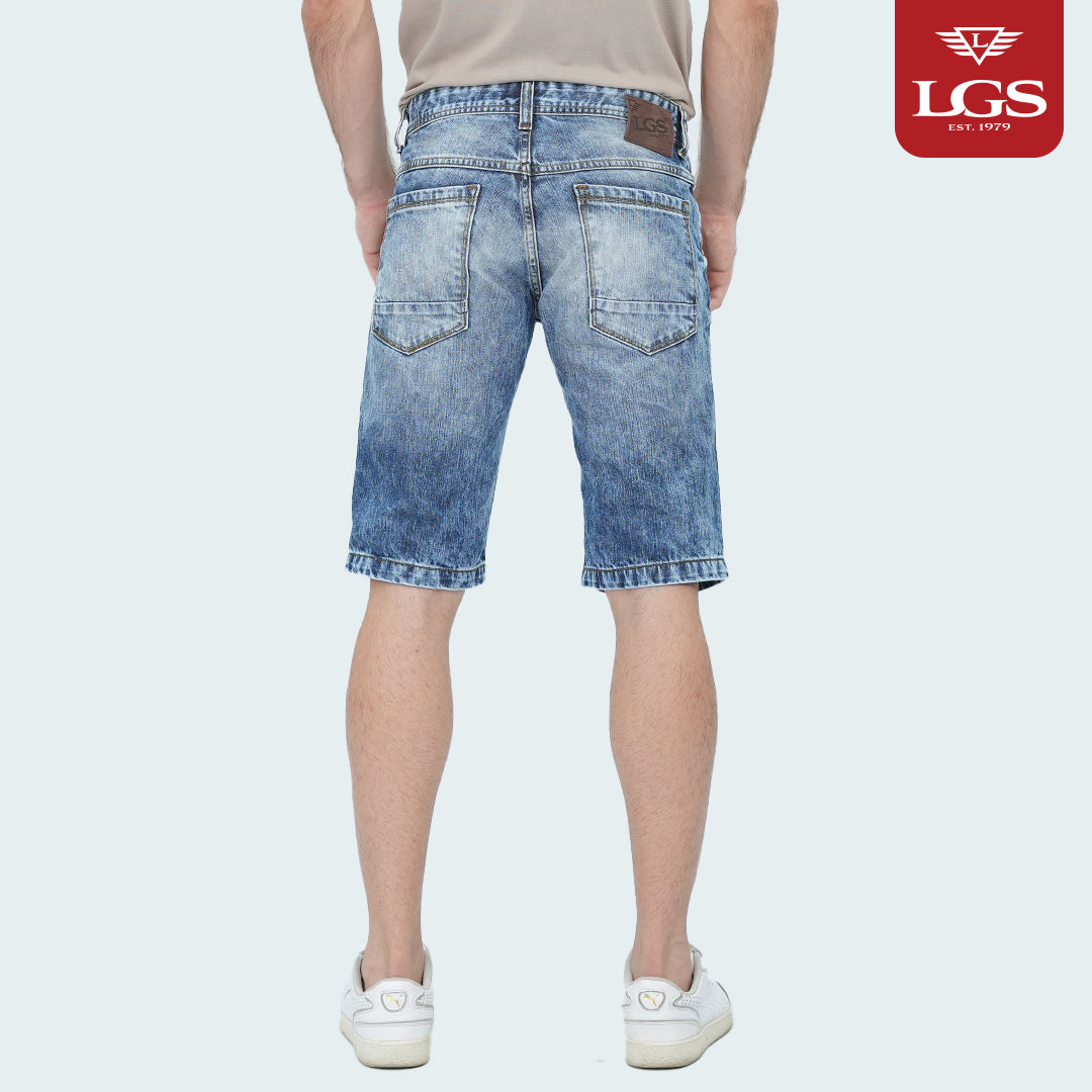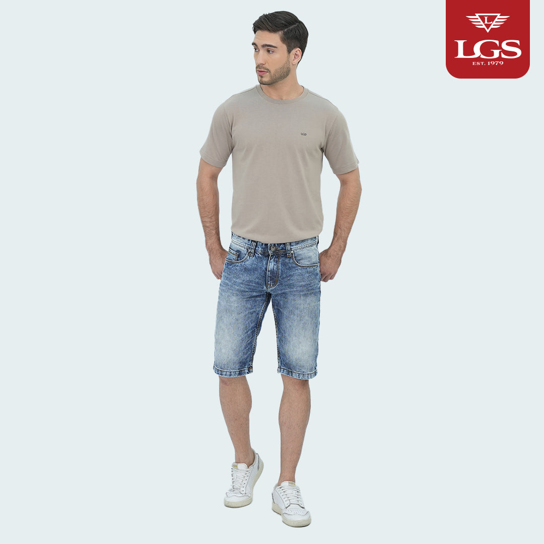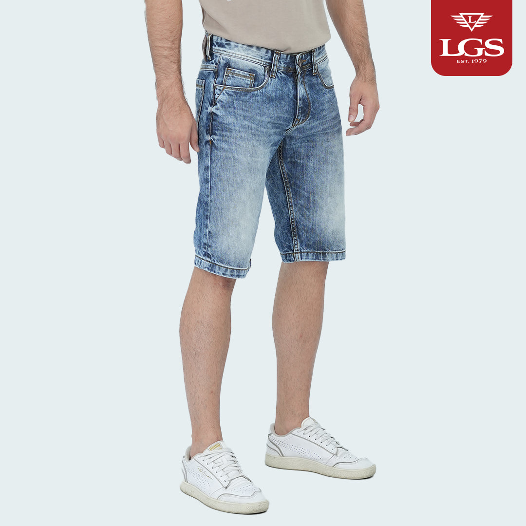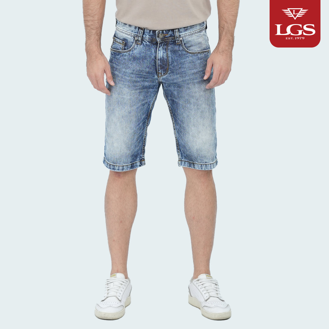 "Celana jeans pendek 5-pocket warna light blue wash yang menghadirkan ketahanan dan gaya dalam kualitas premium.