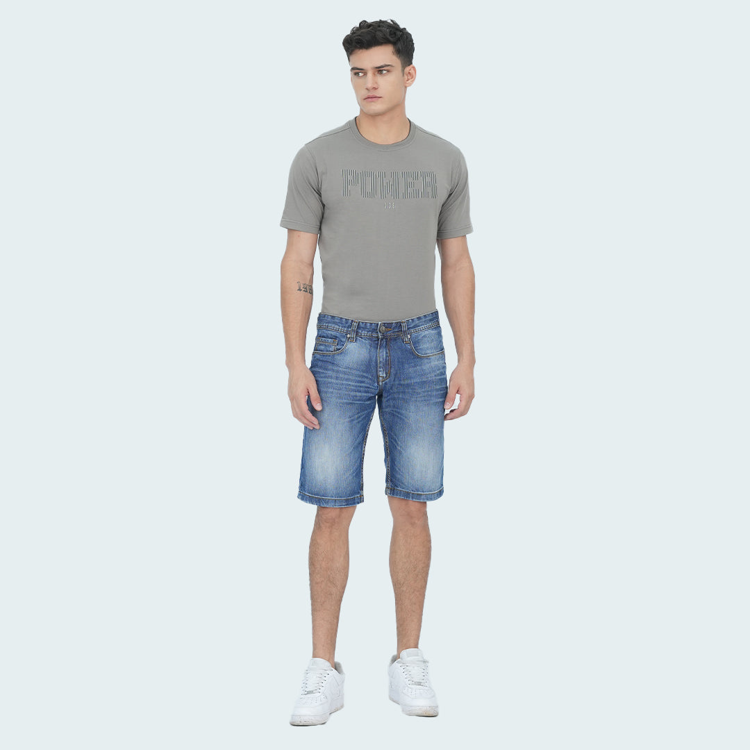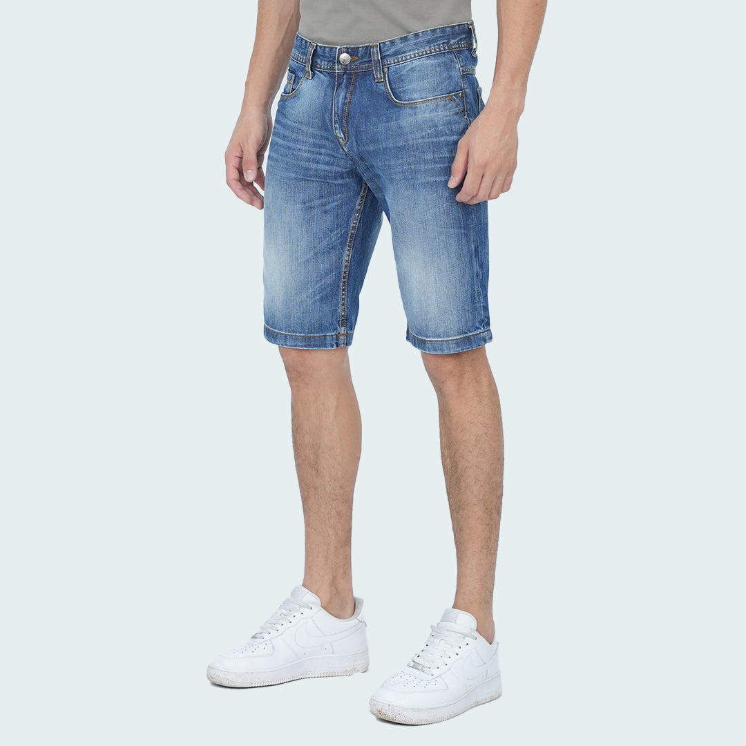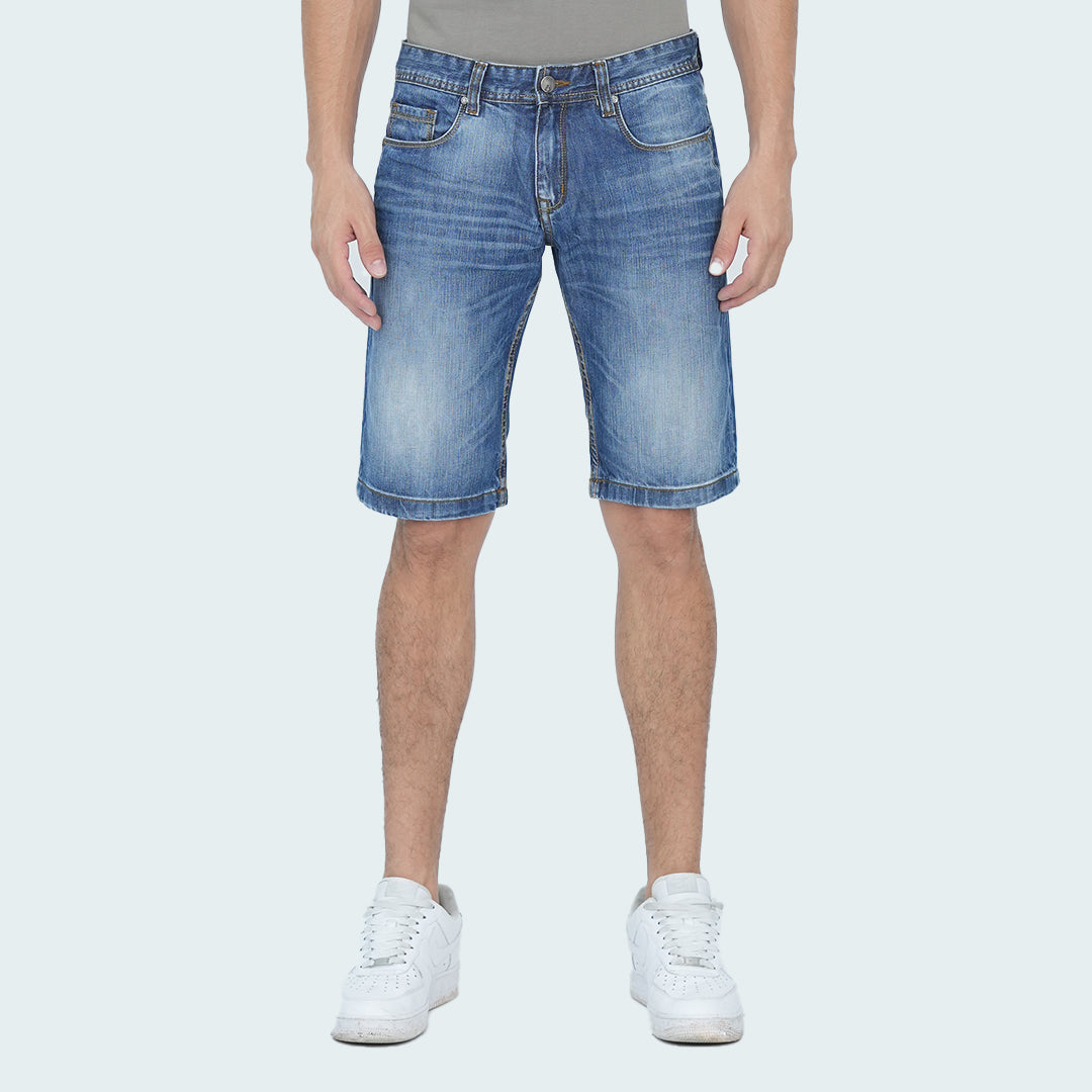 "Celana jeans pendek 5-pocket warna blue wash yang menghadirkan ketahanan dan gaya dalam kualitas premium.