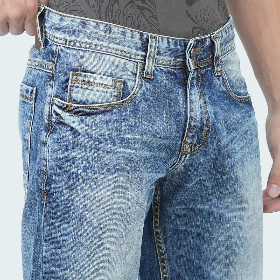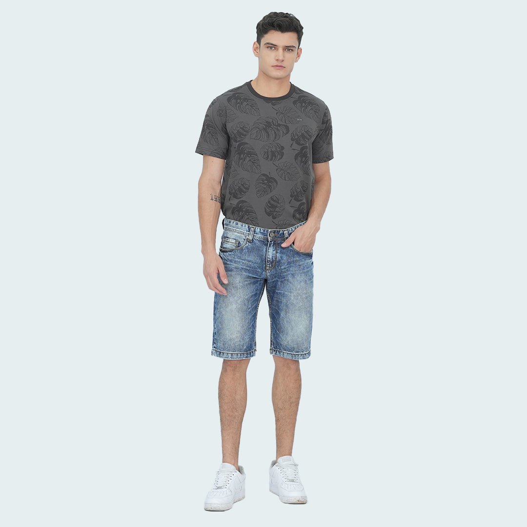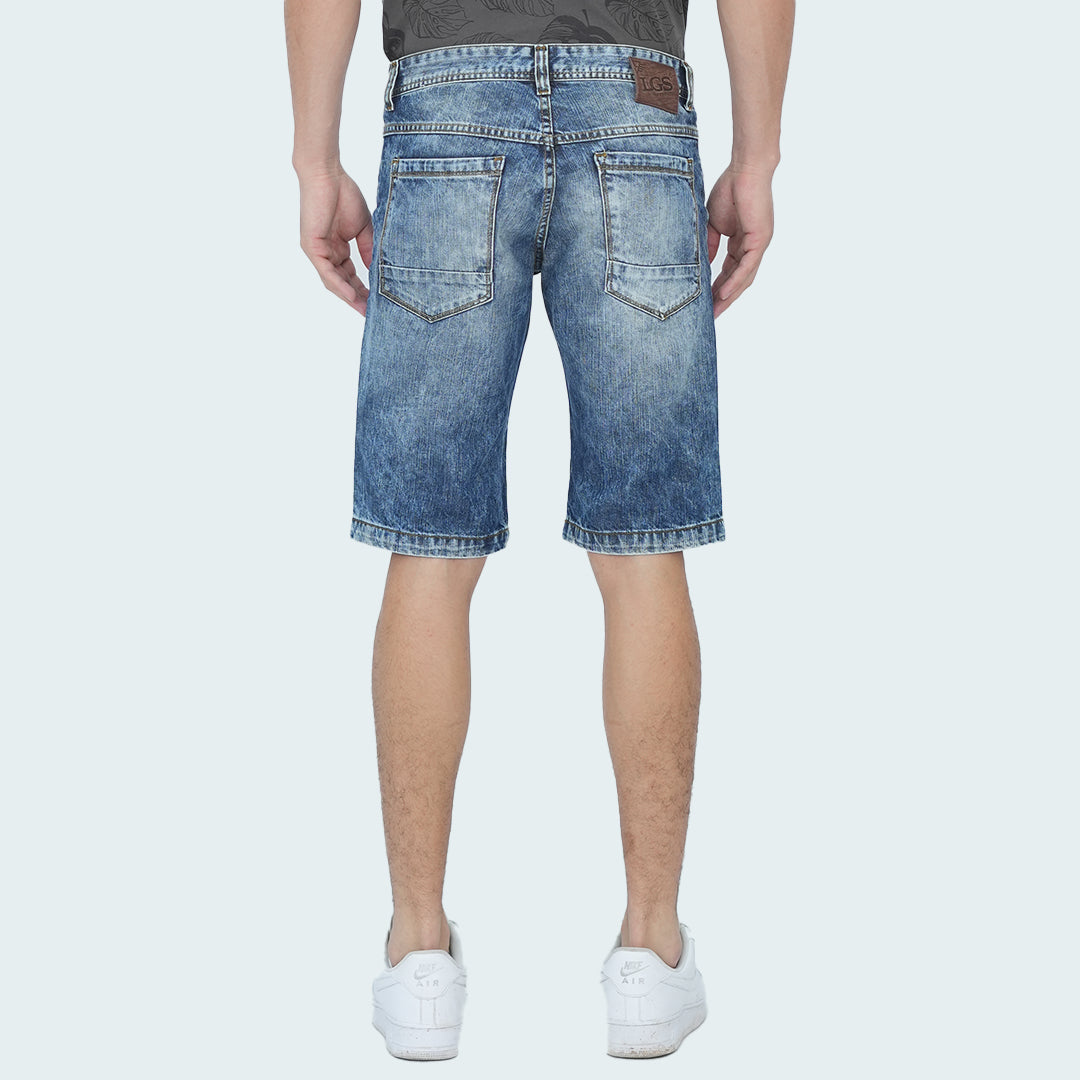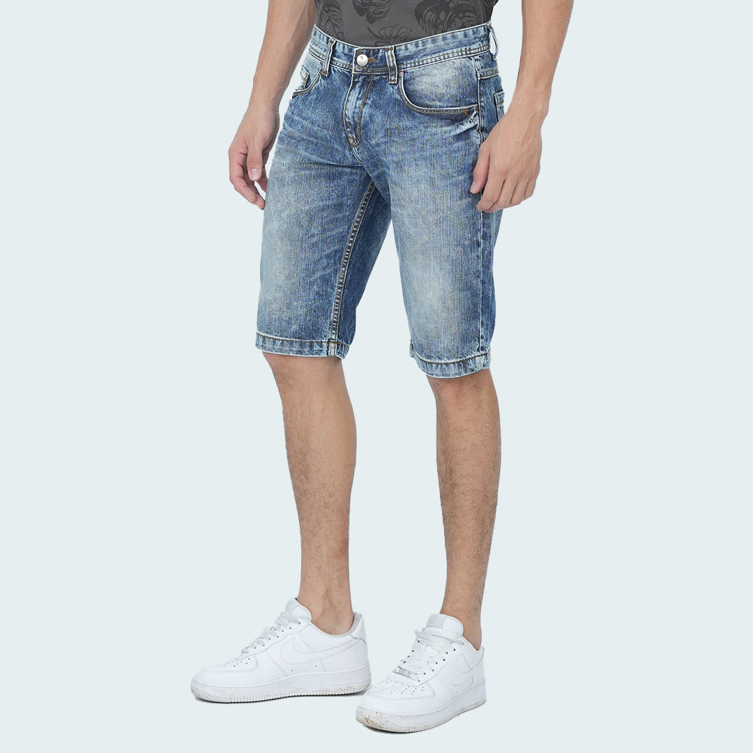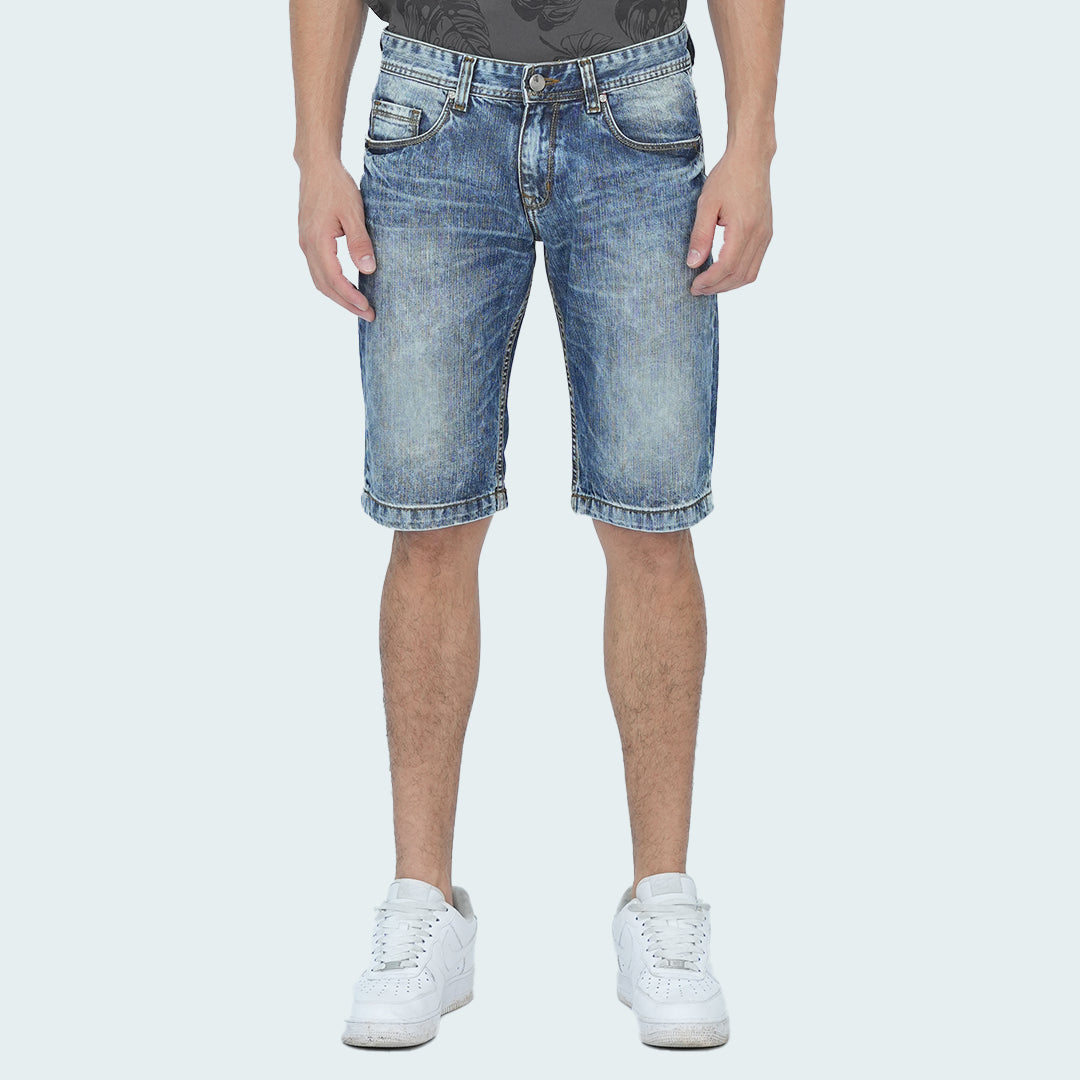 "Celana jeans pendek 5-pocket warna blue wash yang menghadirkan ketahanan dan gaya dalam kualitas premium.