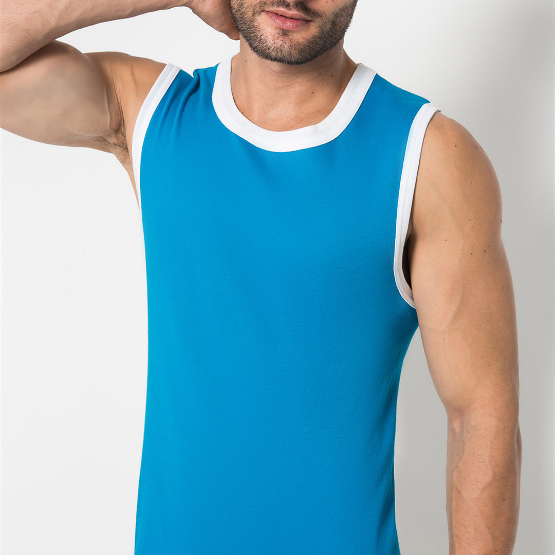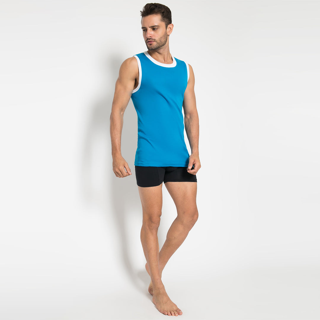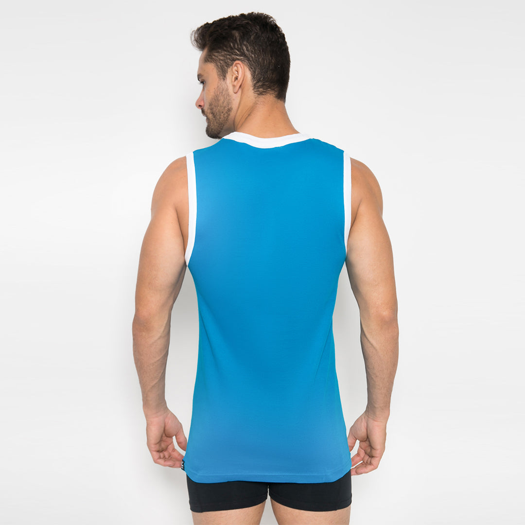 Pakaian dalam Tanktop Pria dari LGS, dengan warna dasar Biru dan dipadukan dengan nuansa warna putih dibagian leher dan lengan . Bahan Katun dan nyaman dipakai , cocok untuk dipakai sehari - hari .