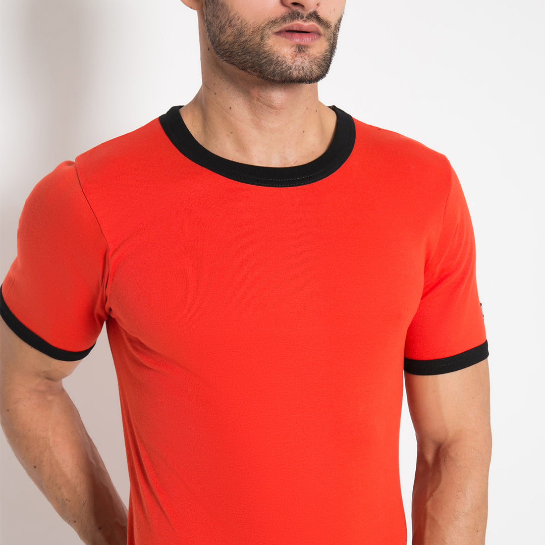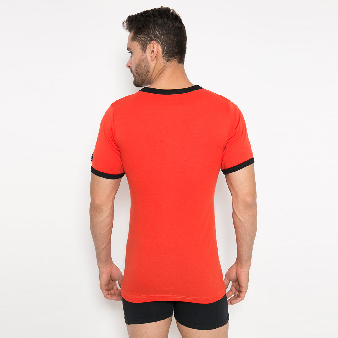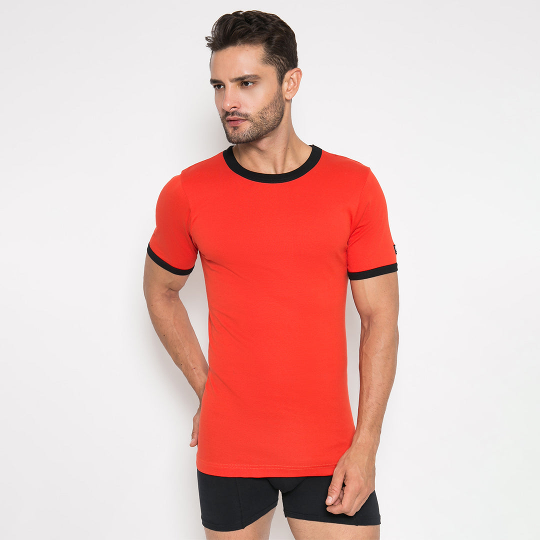 Pakaian dalam Pria dari LGS , dengan warna dasar Orange dan dipadukan dengan nuansa warna Hitam dibagian leher dan lengan . Bahan katun dan nyaman dipakai , cocok untuk dipakai sehari - hari . Ref : LETS.003.333.OR&H.7C