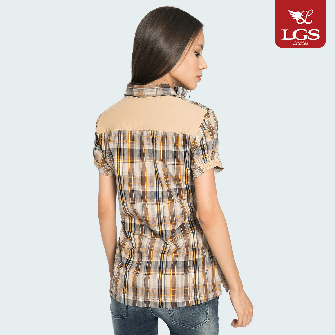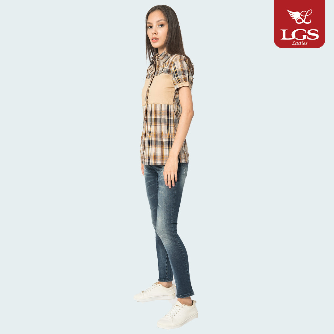 Kemeja Wanita dari LGS dengan warna dasar coklat, menampilkan motif kotak-kotak. Terbuat dari bahan katun berkualitas. Ref : LLSH.380.SL750.481.7C