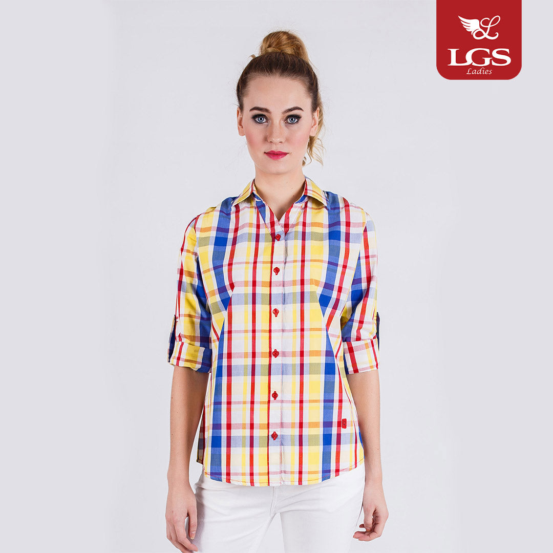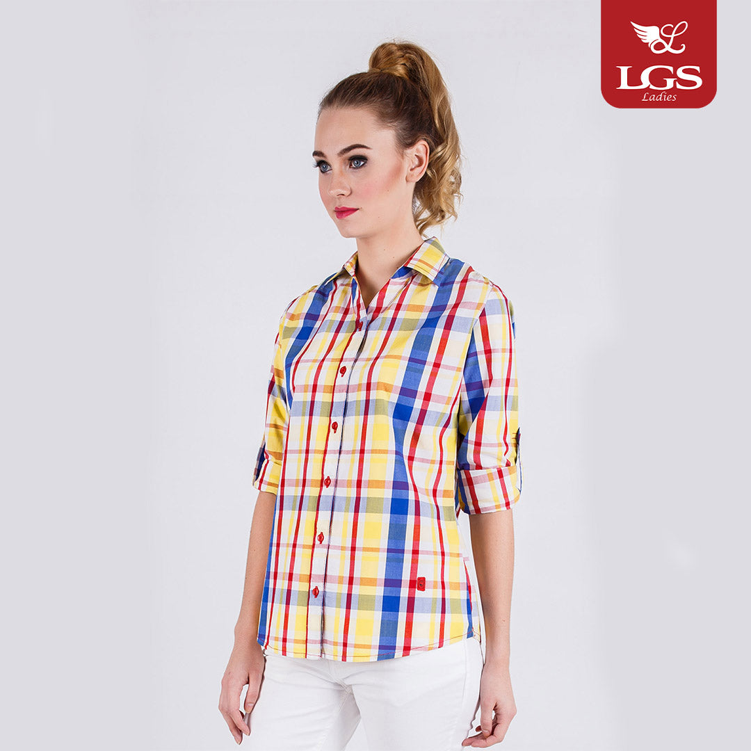 Kemeja lengan panjang dari LGS dengan warna bervariasi kuning, biru dan merah.
