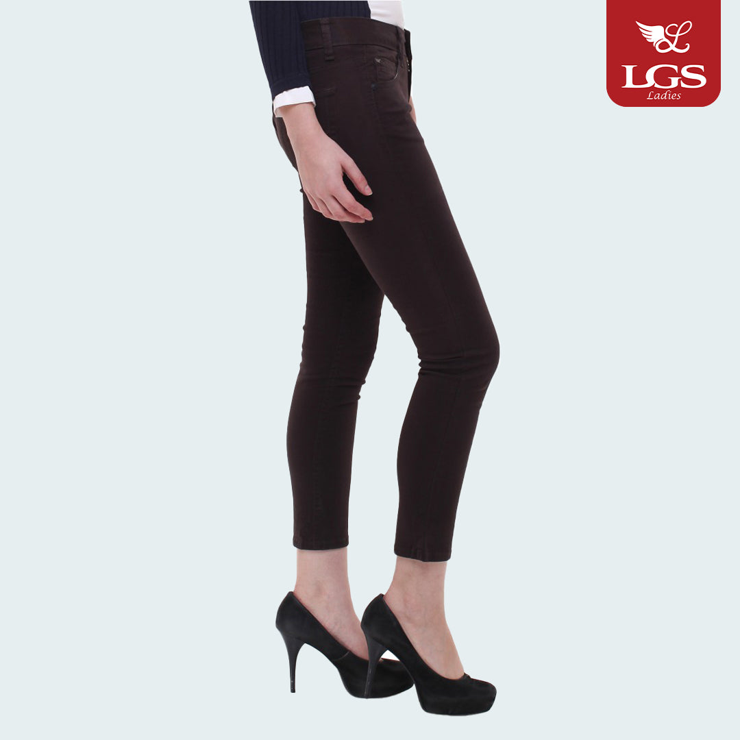 Celana panjang dari LGS dengan warna dasar coklat gelap.