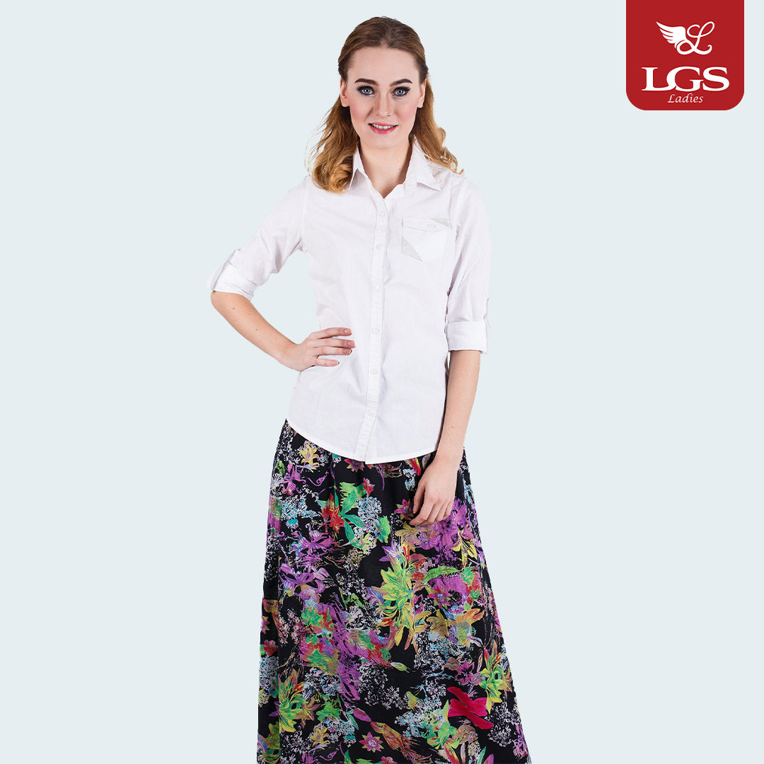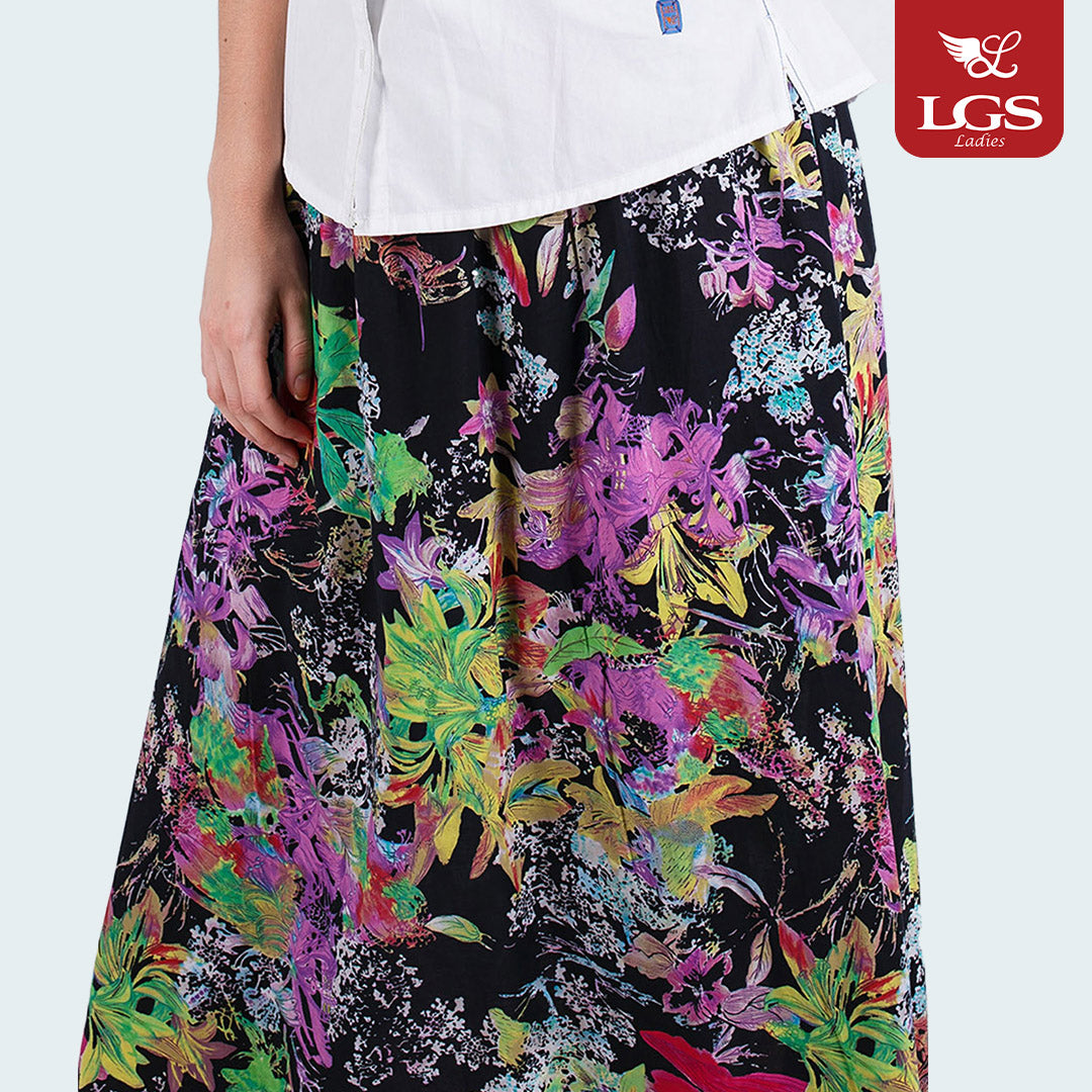 Celana rok panjang dari LGS dengan warna dasar hitam. Divariasi dengan gambar bunga berwarna warni. sehingga terlihat sangat menarik.